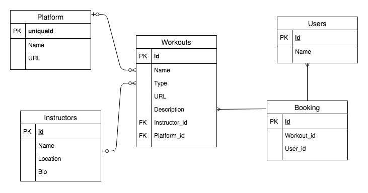 The relationship between these two models is something I envisioned seeing when creating my user story. I wanted a user to be able to save and book a class to their feed. A user should also be able to look at all of the classes they have taken historically, to see the instructors they liked or the class types they enjoy. Therefore, a has_many :through relationship was the correct option between these two models. Additionally, I could have just created a WorkoutUser join table but that relationship could also be represented through a Booking model. I updated my model associations to account for this new association and added in a virtual Platform model, so users could easily filter and search for workout classes using their favorite platform as a filter.