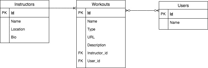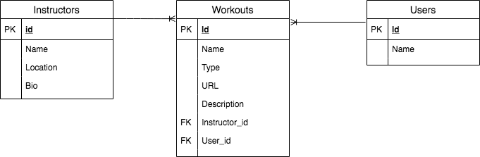 I needed a class model (or Workout to avoid naming confusion), Instructor model and a User model to start with, associating them in the following ways. The Workout model would belong to both the User and the Instructor, as an instructor has many classes and users will take many classes.