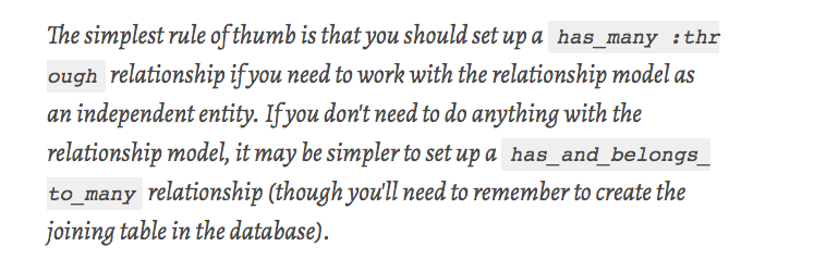 My Workout and User classes would be associated with a type of has_many relationship, however I needed to narrow down if it was a has_many :through relationship, using a join table, or a has_and_belongs_to_many relationship. I turned to the rails guide, which recommends the following.